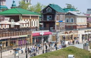 シベリアでもイルクーツクには伝統的な木造の建築物が残っています。この130地区はその建築様式を模したショップやカフェ・レストランが建ち並ぶオールド・イルクーツクを再現したエリアです。 市章でもある「バブル像」をスタートして最後は一番賑わうモール・クバルタールまで歩きます。