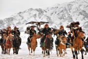 コンテストに参加するカザフ族は色艶やかな衣装に身をまとい、日ごろ調教している自慢の鷲を披露します。馬に颯爽とまたがり腕にはパートナーである鷲をのせコンテストは行われます。 人馬一体となり、鷲との連携をはかり狩りをする姿は圧巻です。