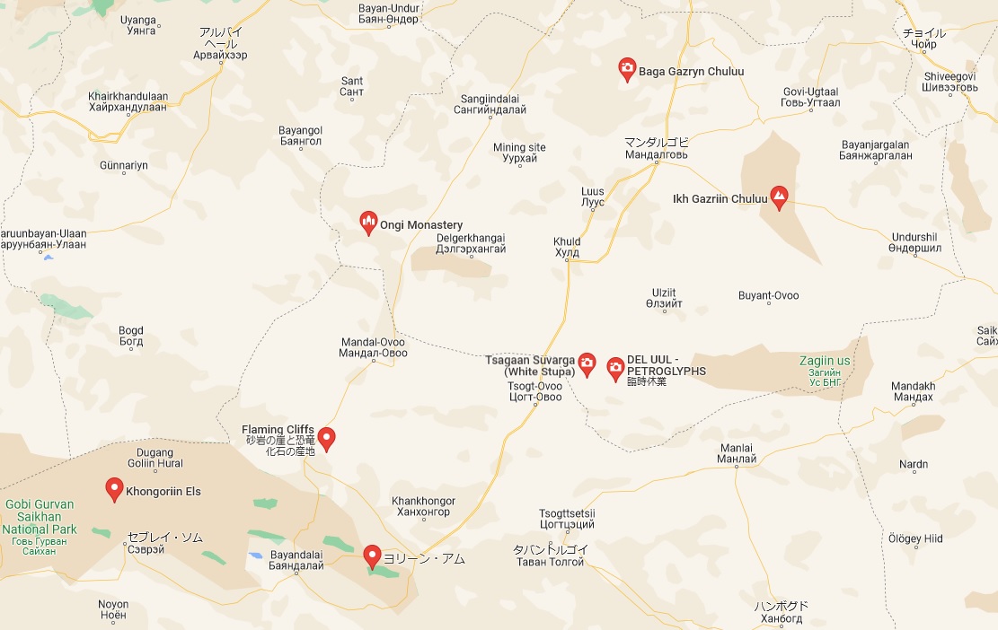 名観光地は別々で特徴的な場所ですが、モンゴルで№1といわれるこの大砂丘で感動的な風景を楽しむ素晴らしい観光地ホンゴル砂丘、野生の羊と山羊、オオカミ、ゴビ熊、はげたか、野生のロバがいるヨリーンアム地方、大雨の後、仏塔の下を流れる急流は、巨大な滝のように見えるツァガーン・スワルガ(白い仏塔)、ゴビ砂漠の赤い砂岩地帯バヤンザグ地域などの特徴があるロケ地です。
