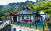 本殿までの参道は途中までが草原、 吊り橋を渡り、最後は石段を上ります。チベット仏教で用いられるマニ車などもあり、今も厚い信仰に支えられています。