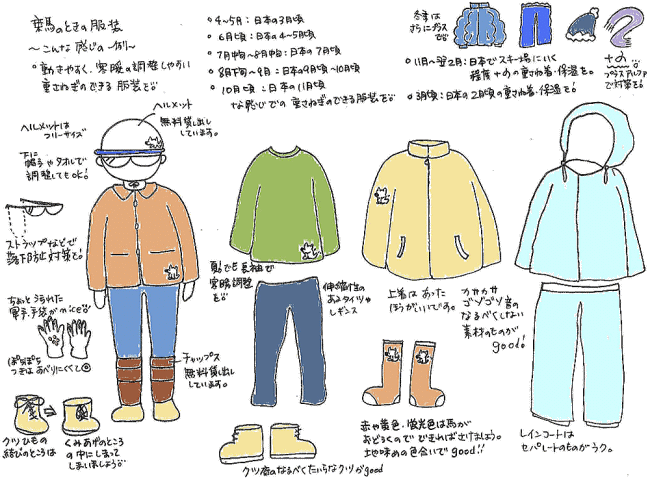 ・歩きやすい軽いブーツ ゲルキャンプのトイレで履くゴム製のスリッパ ・防水・防風のレインコート、マント 暖かいコートまたはジャケット スカーフ、帽子、手袋 ・街中で着るのに適したカジュアルなパンツ、シャツ、プルオーバー、スカートなど ・半袖シャツまたはTシャツ:2~3枚 長袖、セーター:1~2枚 ・大きめのプルオーバーまたはジャケット 薄手(速乾性)のパンツまたはスカート - 2組 ・靴下、下着、寝巻き 頭を覆うスカーフ:1~2枚
