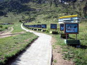本殿までの参道は途中までが草原、 吊り橋を渡り、最後は石段を上ります。チベット仏教で用いられるマニ車などもあり、今も厚い信仰に支えられています。