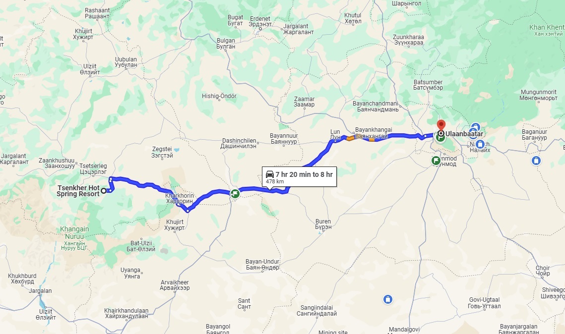 25 kmのハンガイ山地にあります。 この地域は、死火山と温泉で人気があります。 科学者によると、これらの地熱水源は、新生代の火山活動地域の下、ハンガイ